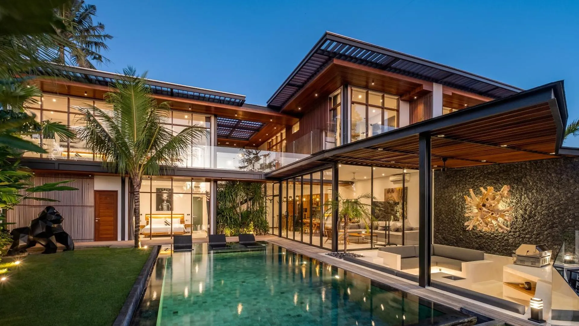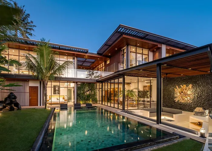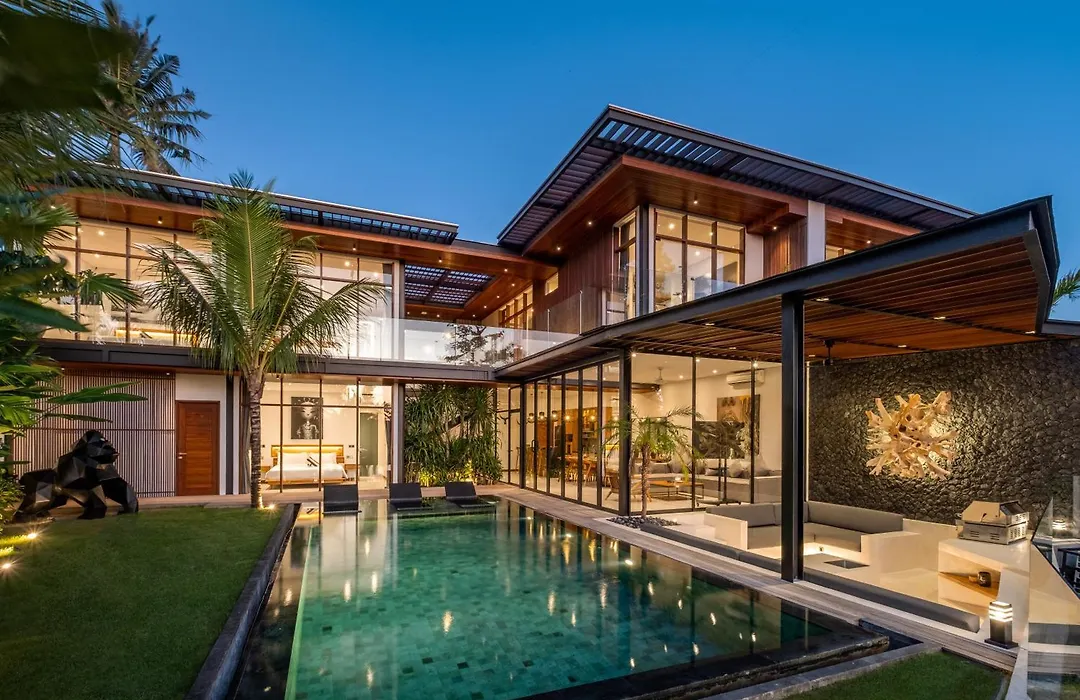 The 5-bathroom villa is located 1.4 miles from Batu Bolong Beach and 2 miles from the greyish Berawa Beach.